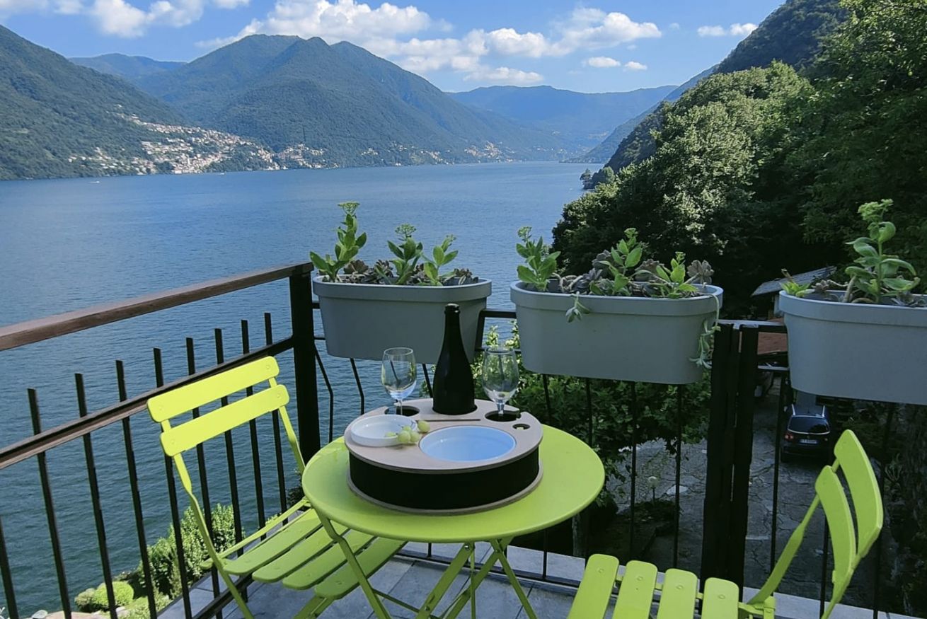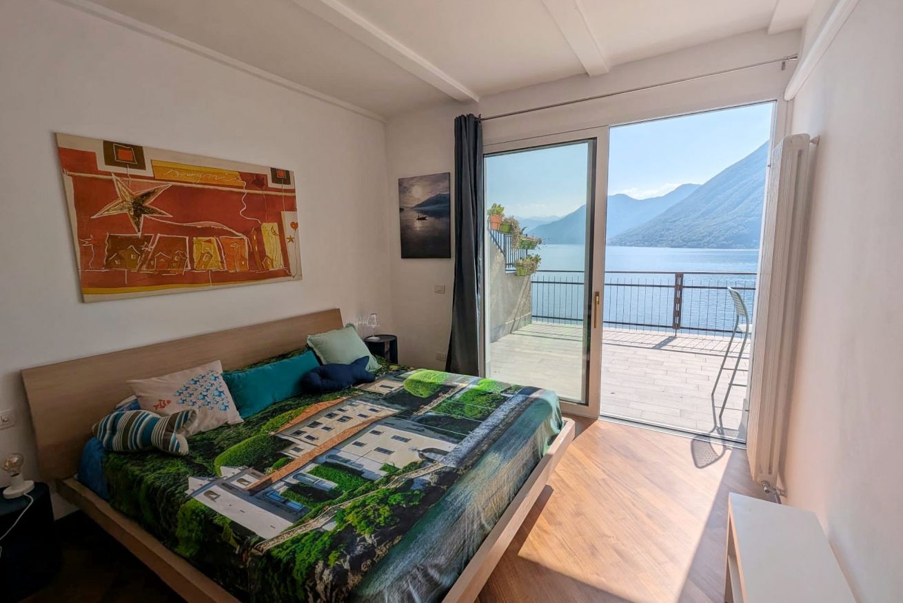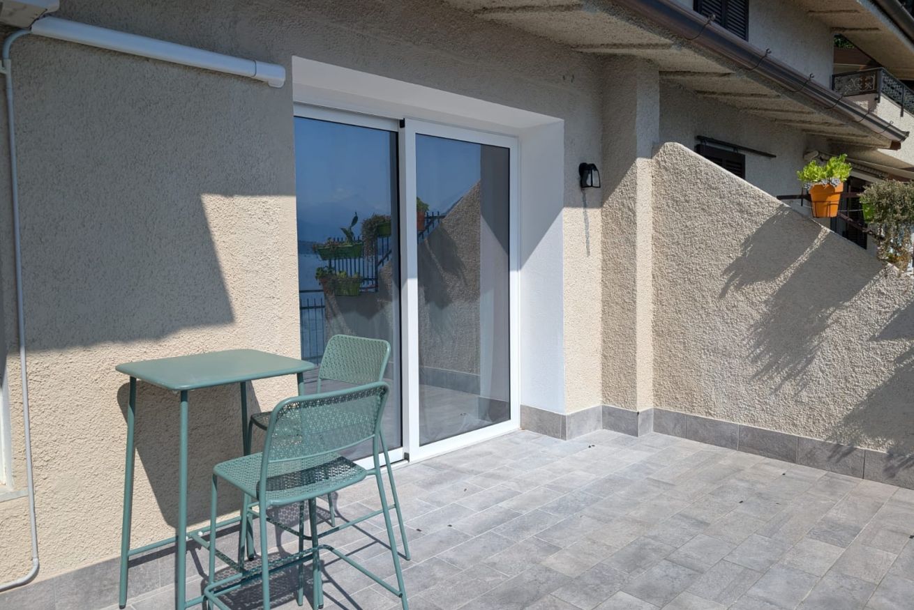 Il vero cuore della casa è il grande terrazzo privato. Qui potrete sorseggiare un caffè al mattino o un calice di vino al tramonto, circondati da un piccolo angolo di verde curato, con una vista mozzafiato che spazia dal blu del lago alle vette circostanti.