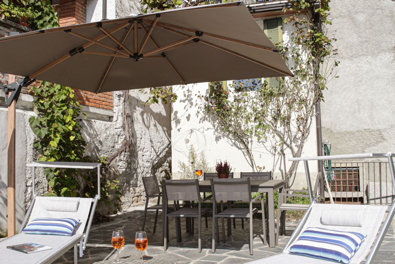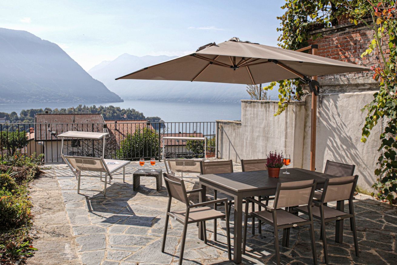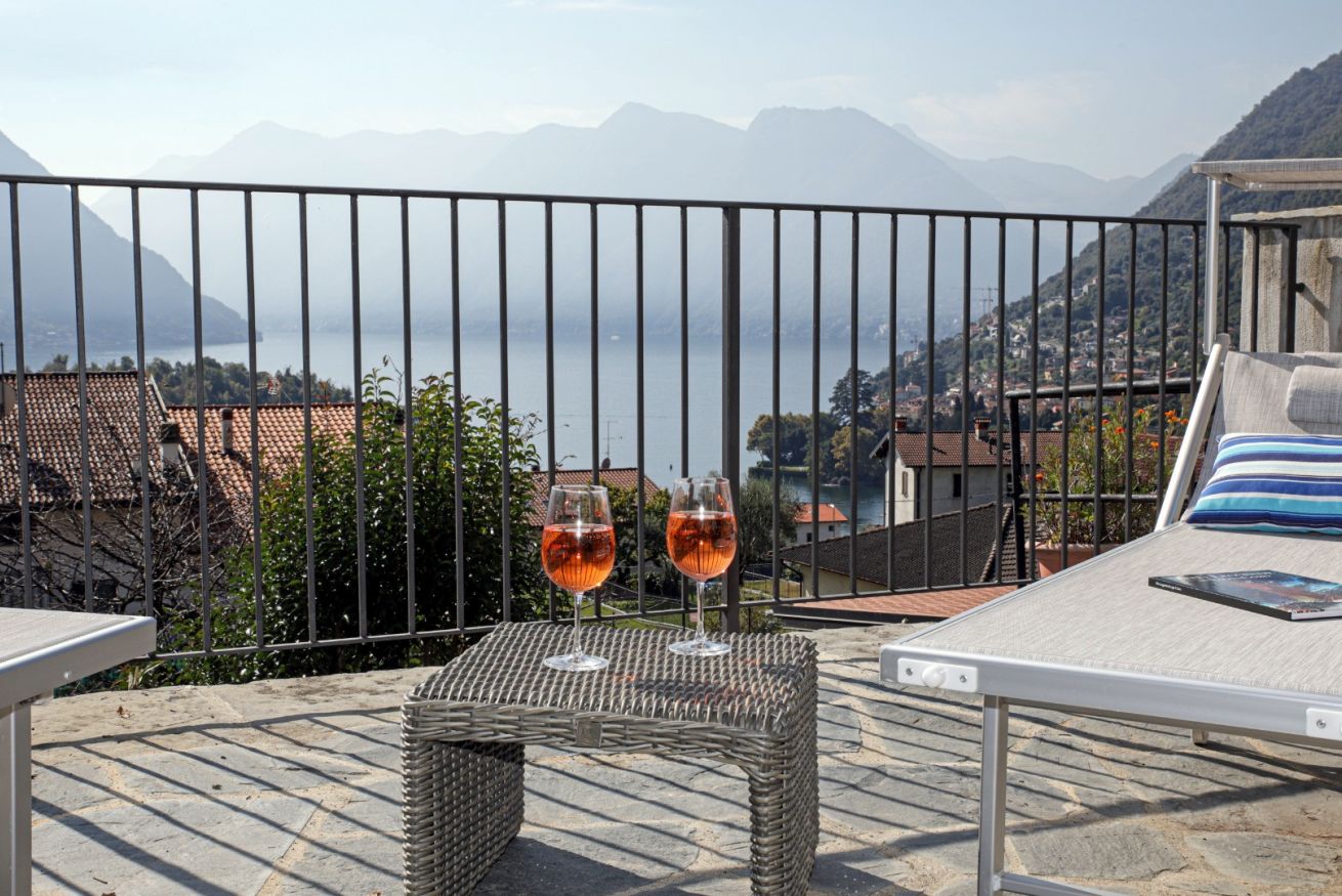 • La Terrazza dei Sogni: Un’ampia loggia privata affacciata direttamente sull’Isola Comacina. Il luogo ideale per colazioni lente, aperitivi al tramonto o cene sotto le stelle avvolti dalla brezza del lago.